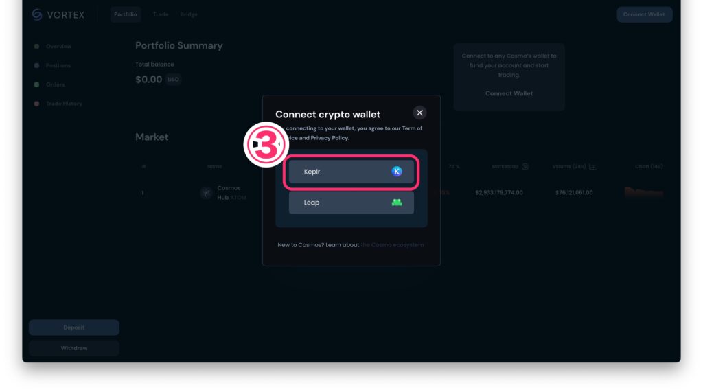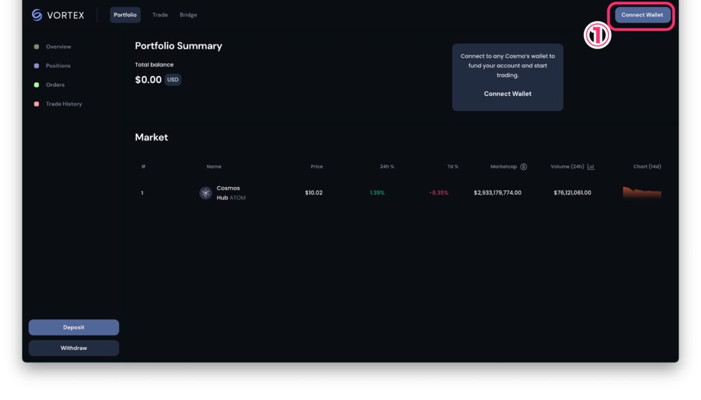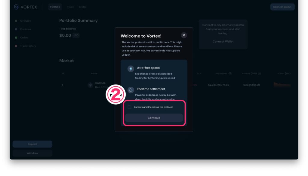 まずはVortex( https://trade.vortexprotocol.io/ )にアクセスしてウォレットを接続。