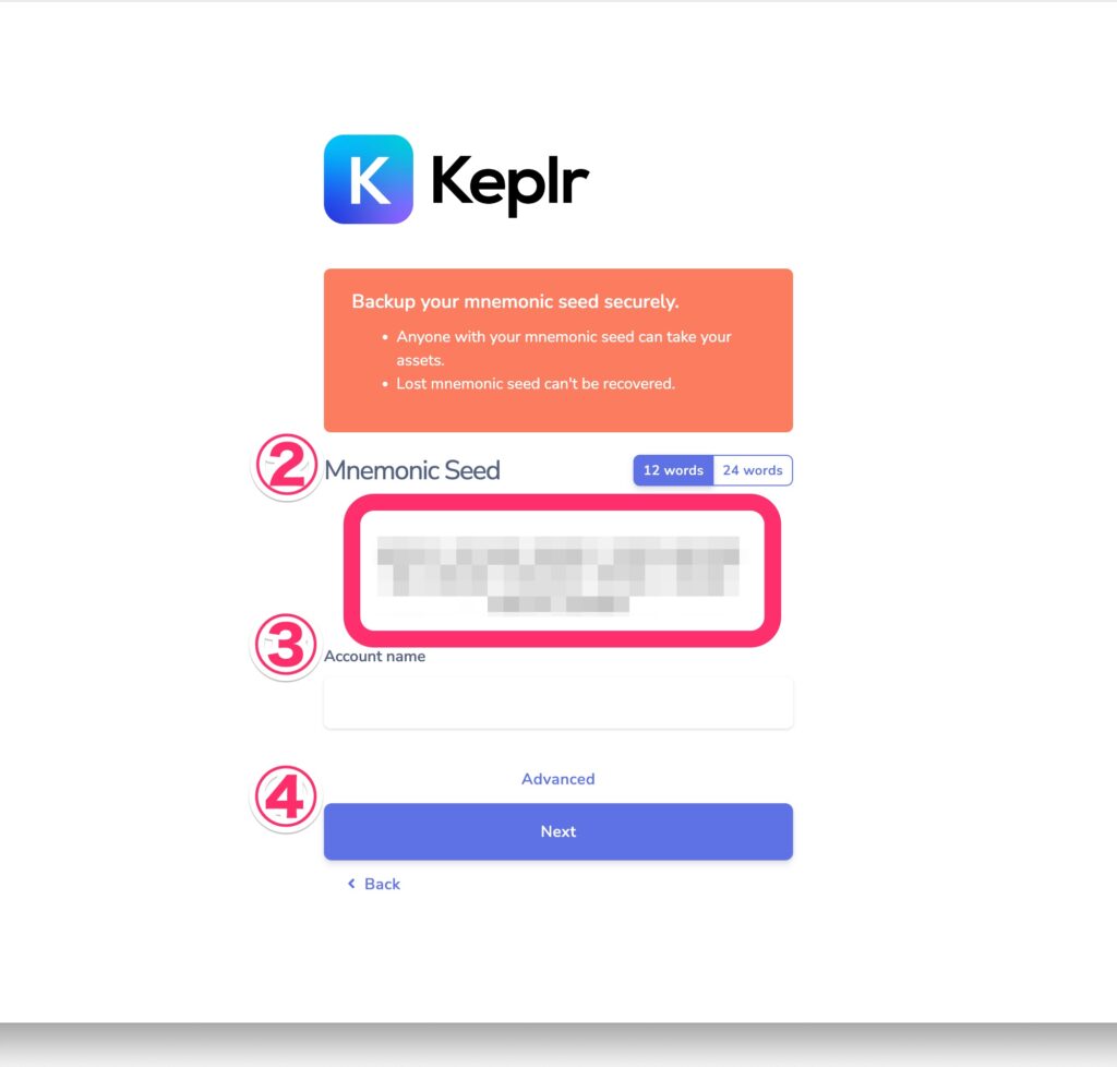 ②ニーモニックフレースを控えて、③任意のウォレットの名前をつけて④【Next】をクリック